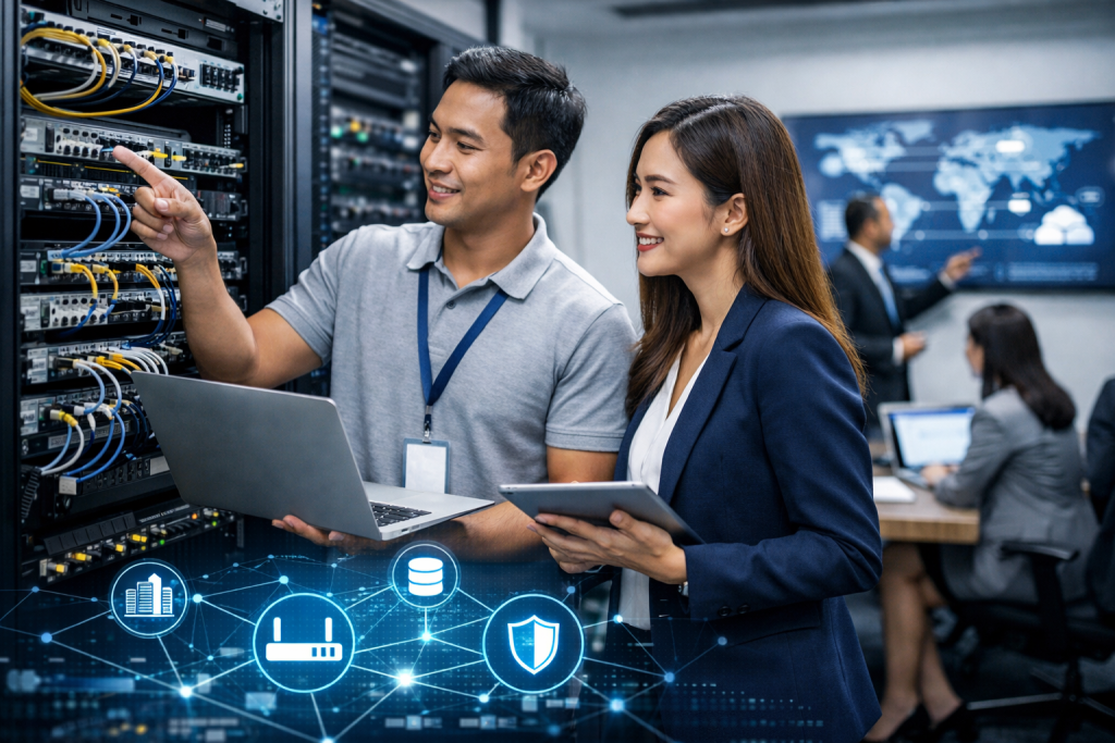 Solusi jaringan untuk perusahaan yang membutuhkan konektivitas antar kantor, monitoring jaringan, dan pengelolaan infrastruktur jaringan yang profesional.